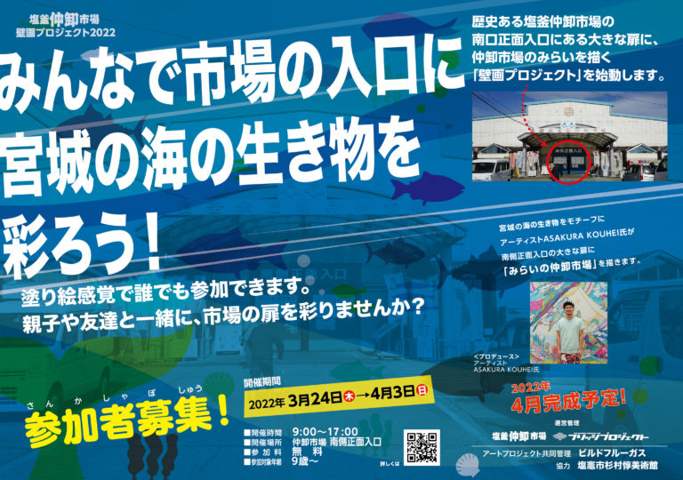 創立56年目を迎える塩釜仲卸市場では、ブルーの大きな扉が一つのシンボルとなっております。 この度、3月24日〜4月3日にかけて市場の玄関口でもある南側正面入口の歴史ある大扉に 宮城県出身の絵かきASAKURA KOUHE … 続きを読む 【終了しました】ASAKURA KOUHEIプロデュース 壁画プロジェクト始動